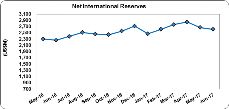 Jamaica’s Net International Reserves totaled US$2,616.81 million as at June 2017, reflecting an decrease of US$55.96 million relative to the US$2,672.77 million reported as at the end of May 2017 (see figure 1).