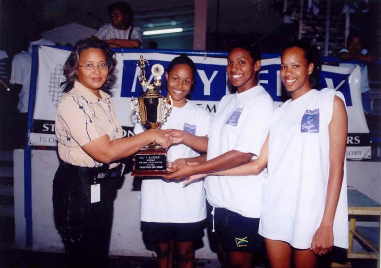 All Smiles- Mrs Kayree Berry-Teape, Marketing Manager of Mayberry Investments Ltd. handing trophy to, top high school female division Immaculate Conception High, at the ASAJ/Mayberry Investments Ltd annual swim meet, held in February 2005.