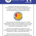 June 4, 2018 Jamaica Broilers Group Limited (JBG) has advised that a connected party sold 112,220,184 JBG shares on May 31, 2018.