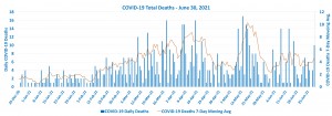 The graph above shows deaths reported since the previous day and the 7-day moving average