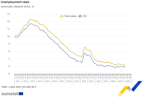 The seasonally adjusted unemployment rate in the euro area was 6.2% in February 2026, up from 6.1% in January 2026 and down from 6.3% in February 2025. Over the same period, the EU unemployment rate stood at 5.9%, unchanged from January 2026 and lower than 6.0% in February 2025.