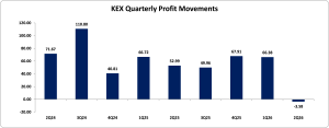 Knutsford Express Services Limited (KEX) for the six months ended November 30, 2025, reported a 4% decrease in revenue totaling $1.01 billion, compared to $1.05 billion for the corresponding period last year. Revenue for the second quarter declined by 17% to $413.00 million, versus $500.15 million for the comparable quarter of 2024.