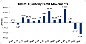 Consequently, Loss per Share (LPS) for the year amounted to $0.02 (2021: EPS $0.27), while the LPS for the quarter totalled $0.12 compared to an EPS of $ 0.04 in the prior year. The numbers of shares used in these calculations were 378,568,115 units. KREMI’s stock price close the trading period on June 24, 2022, at a price of $5.46.