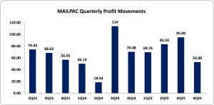 MAILPAC Group Limited (MAILPAC) for the twelve months ended December 31, 2025 reported a 16% increase in Revenue, totaling J$2.98 billion, compared to J$2.56 billion in the corresponding period last year. Revenue for the fourth quarter amounted to J$827.21 million, representing a 1% decline relative to J$839.42 million recorded for the comparable quarter of 2024.