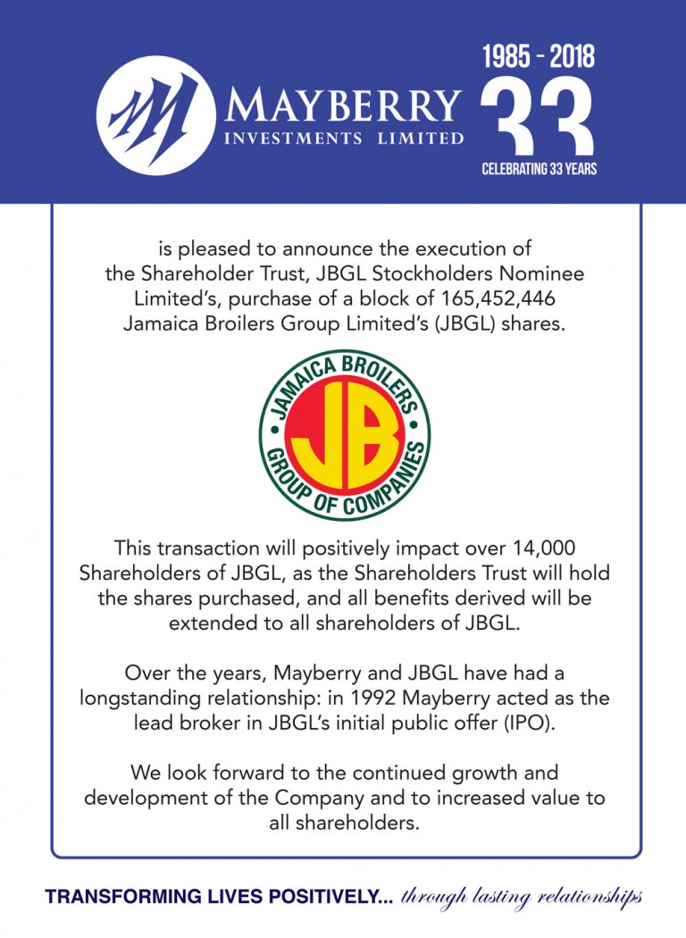 Mayberry announces execution of the Shareholder Trust, JBGL Stockholders Nominee Limited