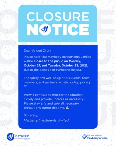 Mayberry Investments Limited Closure Notice October 27 – 28, 2025 Jason2025-10-27T08:29:58-05:00 Share This ! FacebookTwitterLinkedInTumblrPinterestEmail