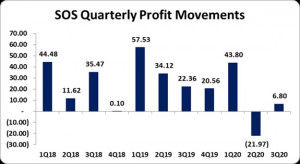 Stationery and Office Supplies Limited (SOS) for the nine months period reported revenues of $711.68 million relative to $933.22 million in 2019, a 24% decrease. For the third quarter, revenues fell by 19% to close the quarter at $239.57 million (2019: $294.67 million). The company highlighted that, “During the third quarter of 2020, SOS was again able to post a profit and had no months in which a loss was experienced, even though the number of confirmed average daily cases of Covid19 was higher than that experienced in the second quarter.”