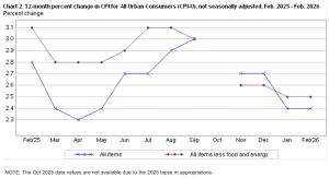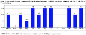 The U.S. Bureau of Labor Statistics reported that the Consumer Price Index for All Urban Consumers (CPI‑U) increased 0.3% on a seasonally adjusted basis in February 2026, following a 0.2% gain in January. Over the past 12 months, the all items index rose 2.4% before seasonal adjustment.